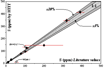 Figure 2.6: S contents obtained by the HTIT method during this study vs published values for international rock standards